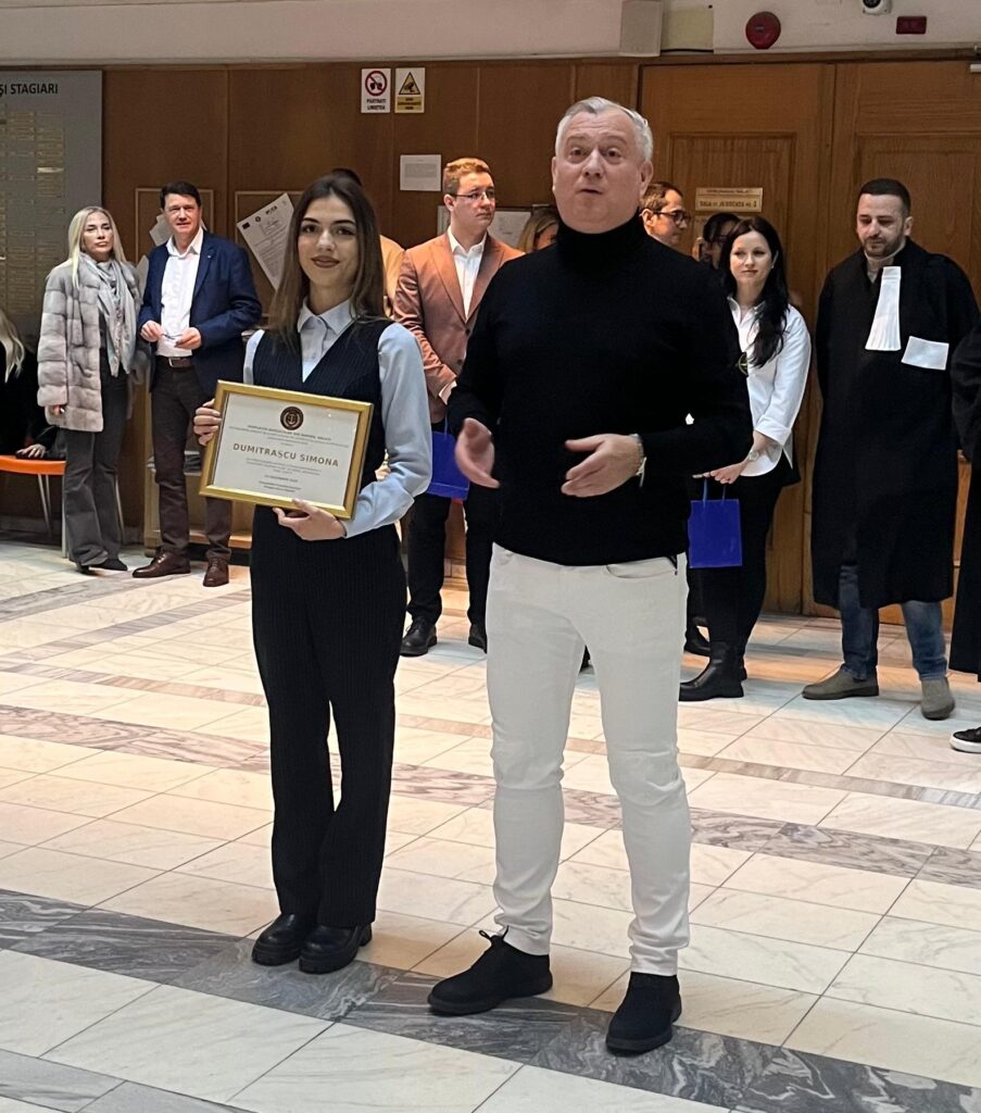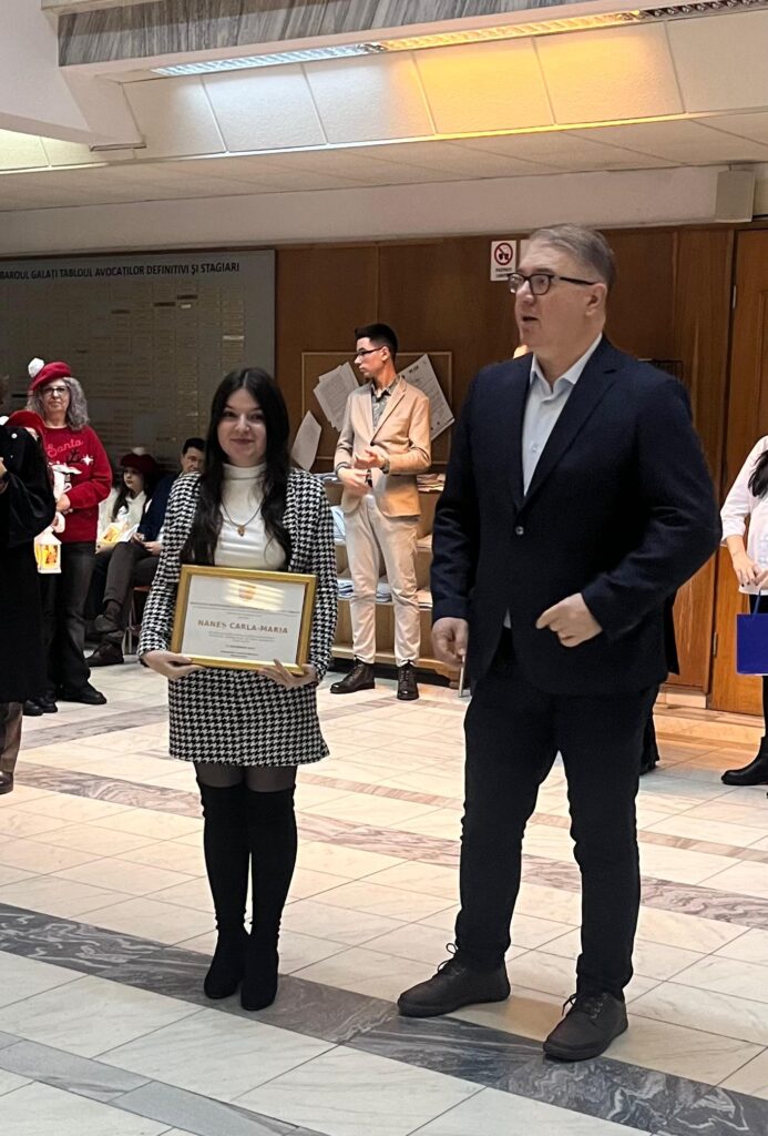 ✨La fel ca anul trecut, au primit diplome de excelenţă, o încurajare emoţionantă pentru viitorii profesionişti ai dreptului, studentele de la Facultatea de Drept care s-au remarcat în mod deosebit, Dumitraşcu Simona, din partea Asociaţiei Avocaţilor din Baroul Galaţi şi Naneş Carla-Maria, din partea Asociaţiei profesionale a Judecătorilor „Al.I. Cuza” Galaţi.